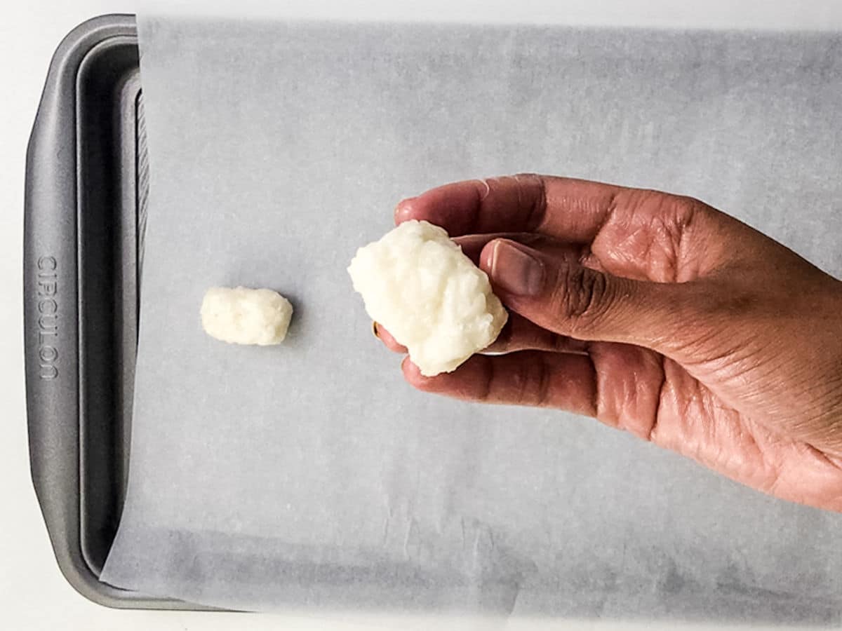 3. Shape the mixture into small balls (about 1 tablespoon each) and place them on the prepared baking sheet, spaced apart.