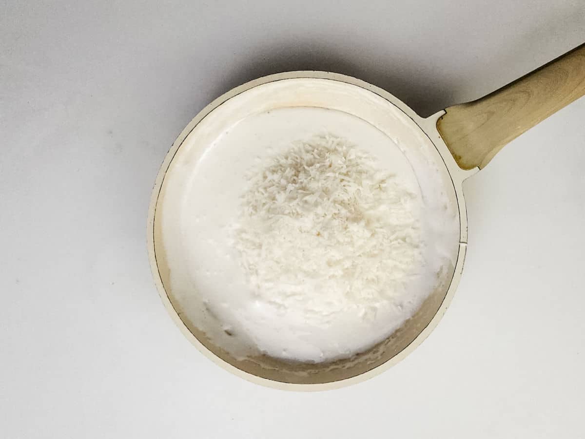 - Remove from the heat and add the shredded coconut. Stir until evenly distributed and let the mixture cool completely and firm up.