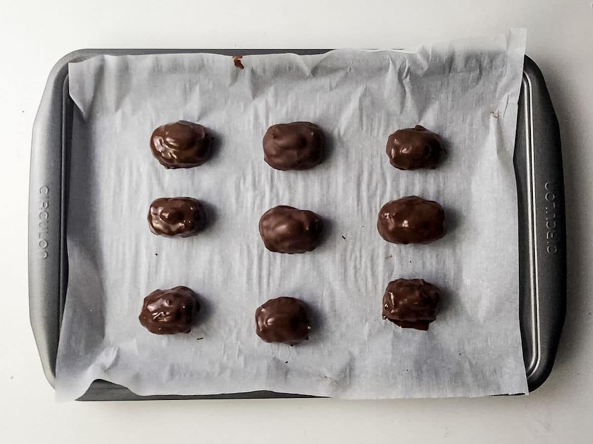7. Allow the chocolate to set by refrigerating the bites for 10 minutes or until the chocolate hardens.