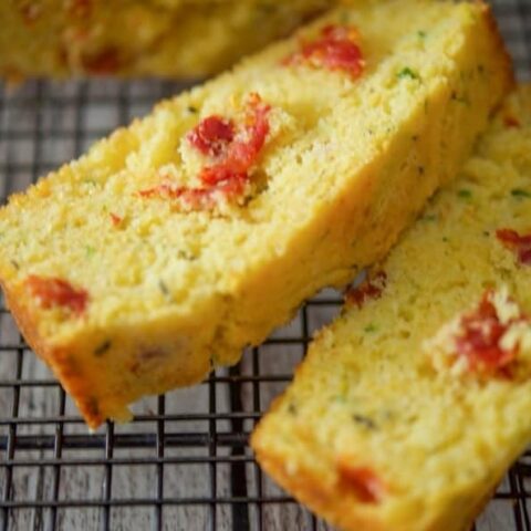 Savory Italian cornbread features yellow cornmeal, zucchini, sun-dried tomatoes, and pecorino romano cheese. A delicious twist on a classic favorite!