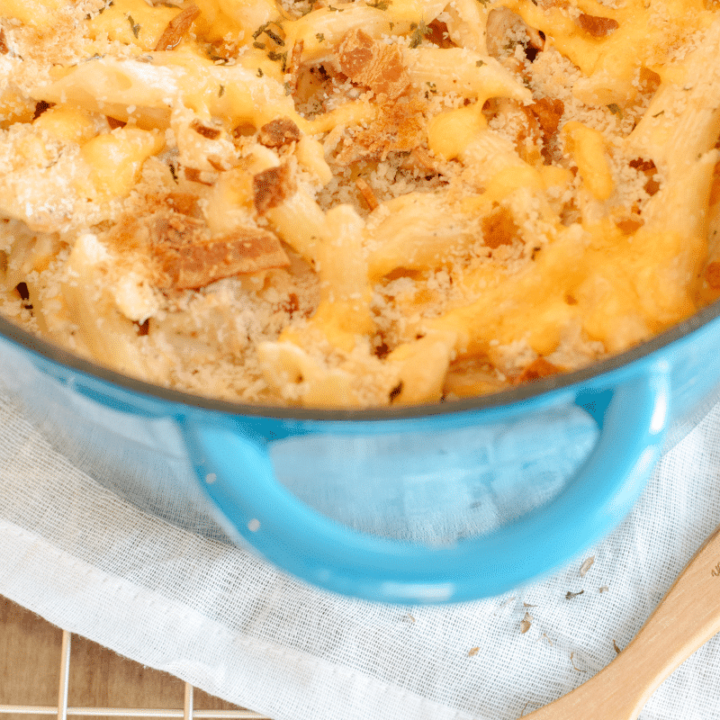 This simple weeknight meal is packed with creamy cheese, crispy bacon, and tender chicken mixed with pasta, making it a dish that the entire family will enjoy.