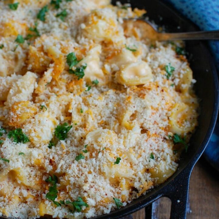 This recipe for baked mac and cheese with breadcrumbs is a simple way to make macaroni and cheese at home. It features your preferred pasta, a creamy cheese sauce, and crunchy panko breadcrumbs on top.