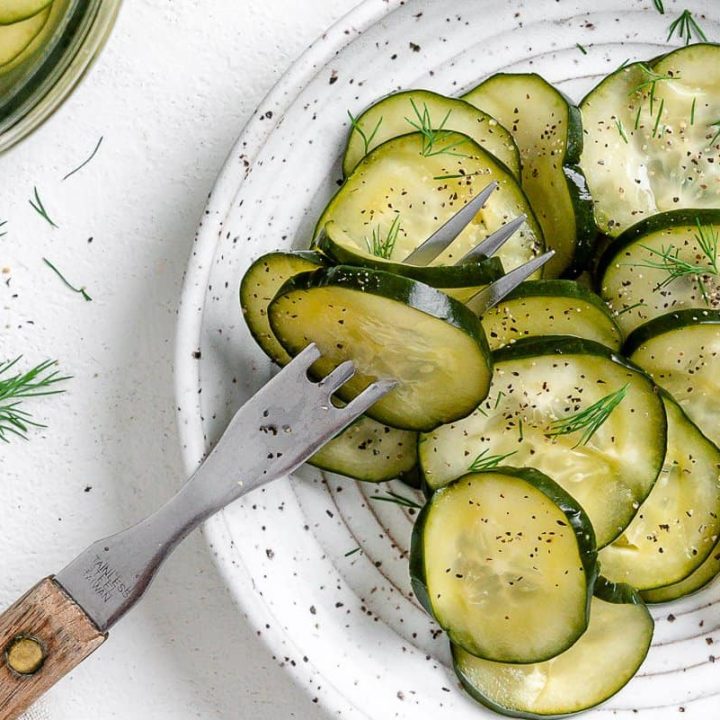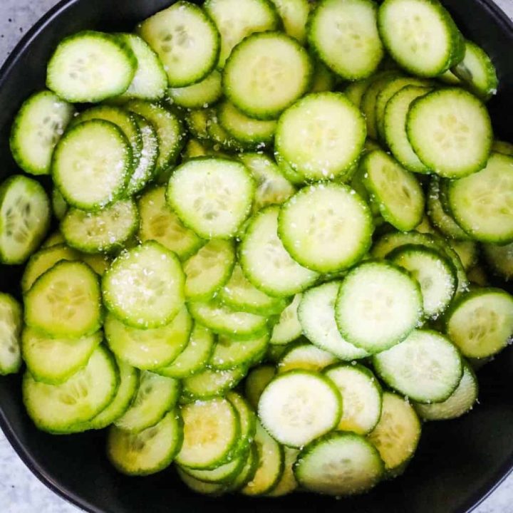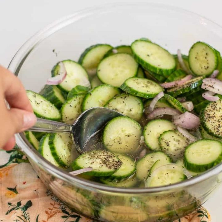 The simple, classic German side dish, "Gurkensalat". This Easy Old-Fashioned Cucumber Salad is just like grandma used to make! Thinly sliced cucumber and onions, chilled and marinated in a sweet vinegar