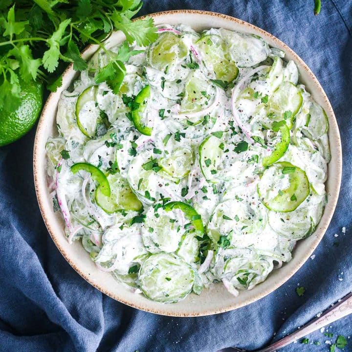 Light and refreshing, this simple Mexican-style cilantro-lime cucumber salad is perfect for summer. This healthy side dish is a great accompaniment to grilled salmon, chicken, and more