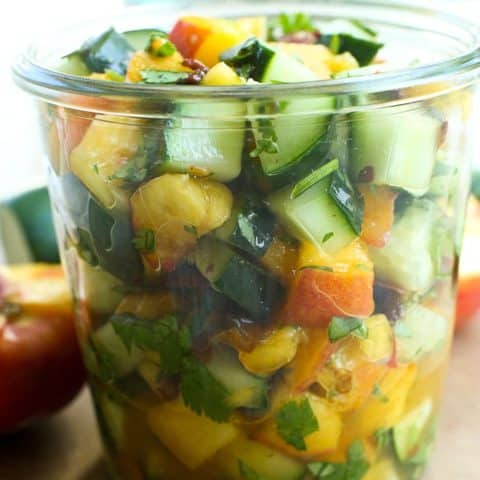 This Cucumber Peach Salsa is a breeze to make and can be a snack, appetizer, or the perfect way to elevate your summer dinners! It’s made with cucumber, peaches, lime, and fresh cilantro, and gets a kick from the chipotle pepper. The perfect mix of sweet + heat!
