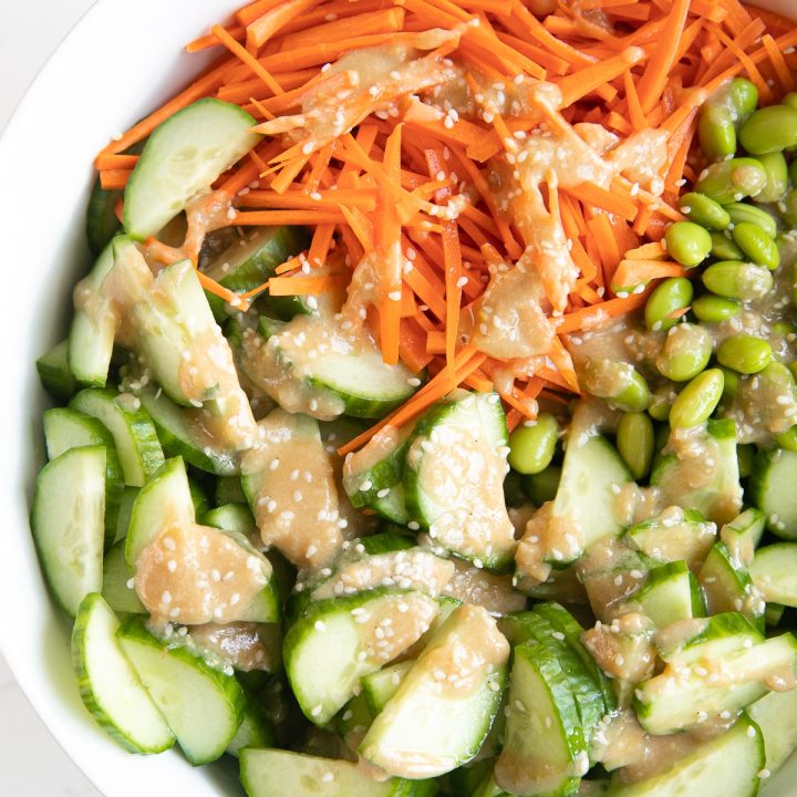 This delicious Miso Cucumber Salad is filled with cucumbers, carrots, and protein-packed edamame, and tossed with a mouth-watering homemade miso dressing. Perfect for lunch or a healthy side dish, this cucumber salad may be simple, but it’s definitely not boring!