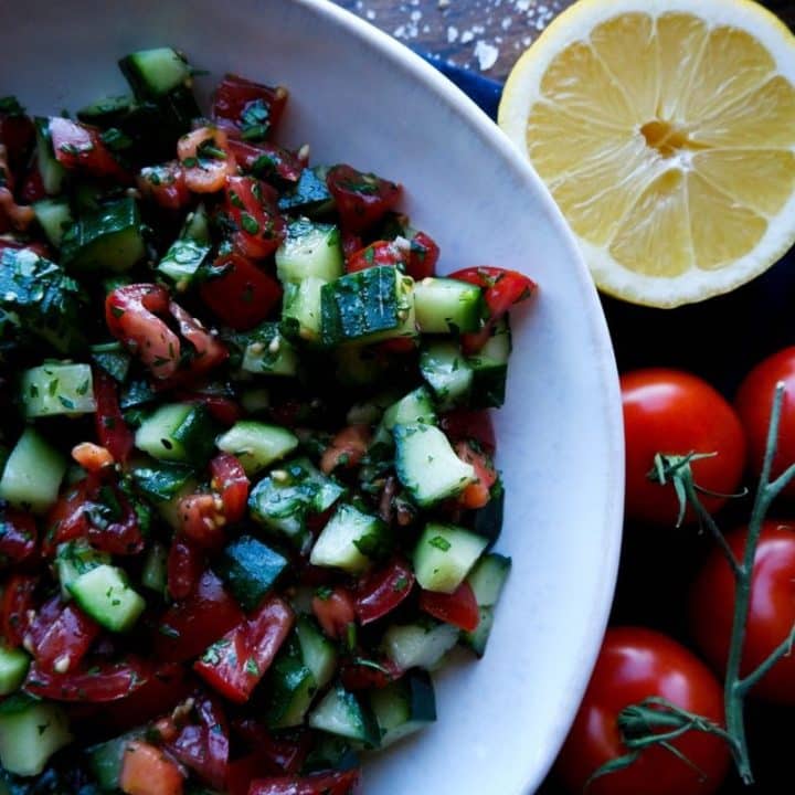 Simple and fresh Shirazi Salad! This refreshing Persian cucumber and tomato salad is so quick and easy, full of fresh flavors, healthy, crisp, and crunchy! It's a great side dish, appetizer, topping, or accompaniment to so many dishes! Naturally gluten-free, vegan, paleo, and keto, this classic Iranian salad recipe will be your new favorite!