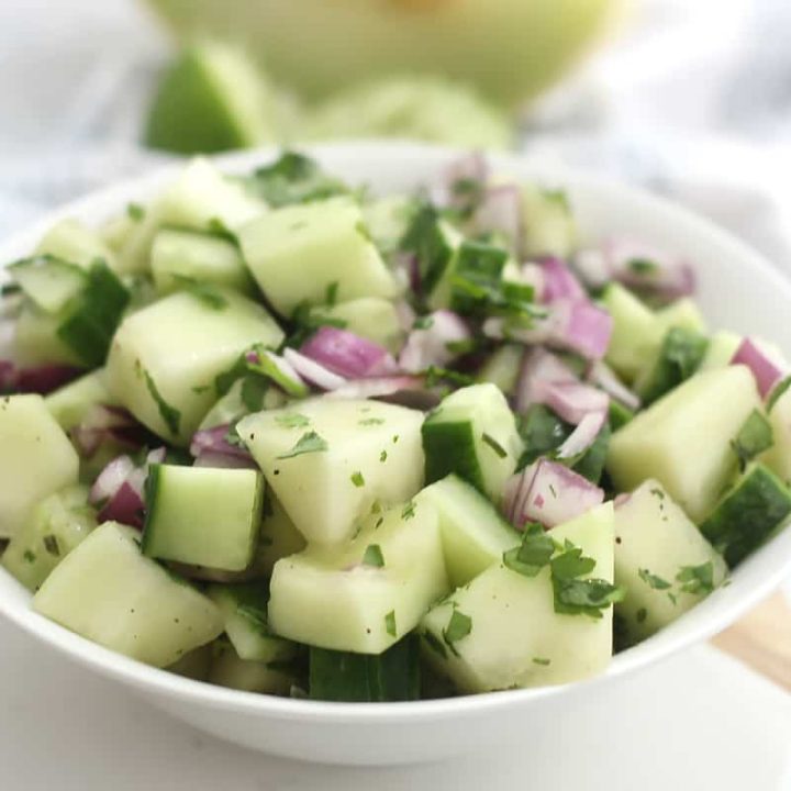 Wonderfully fresh, sweet, and tangy, this melon cucumber salad is the perfect refreshing side to enjoy during the warmer weather. Made with red onion, cilantro and lime juice, this salsa works wonderfully with seafood and is great for topping tacos!