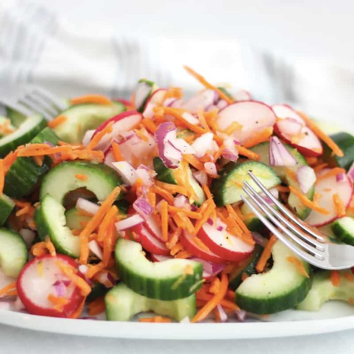 Tossed in a lemon dressing, this cucumber carrot, and radish salad is crunchy, fresh, light, and healthy. Perfect for the warmer weather, it takes minutes to make and is full of texture and flavor. Ideal for picnics and cookouts, this salad side dish works wonderfully with all of your favorite meals.