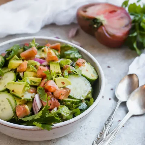 This deliciously crisp cucumber salad is easy to put together. Toss cucumber slices with some tomatoes, avocado, and a tangy vinaigrette.