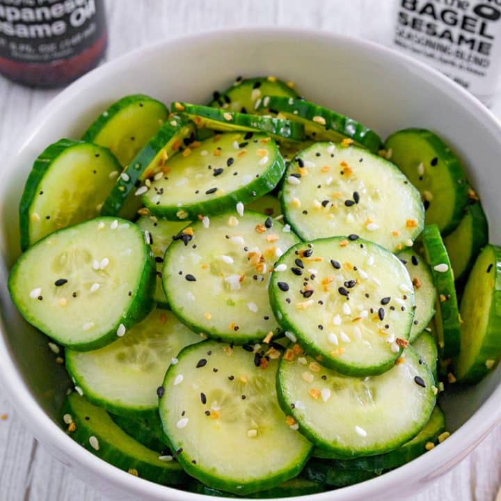 This is the easiest, tastiest cucumber salad you'll ever make! Just 3 ingredients and 5 minutes of prep time. You'll love the combination of fresh cucumbers with everything but the bagel seasoning and a secret ingredient.
