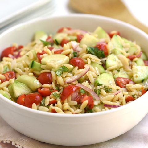 This cucumber and tomato orzo salad is light and refreshing. Perfect for a summer get-together!