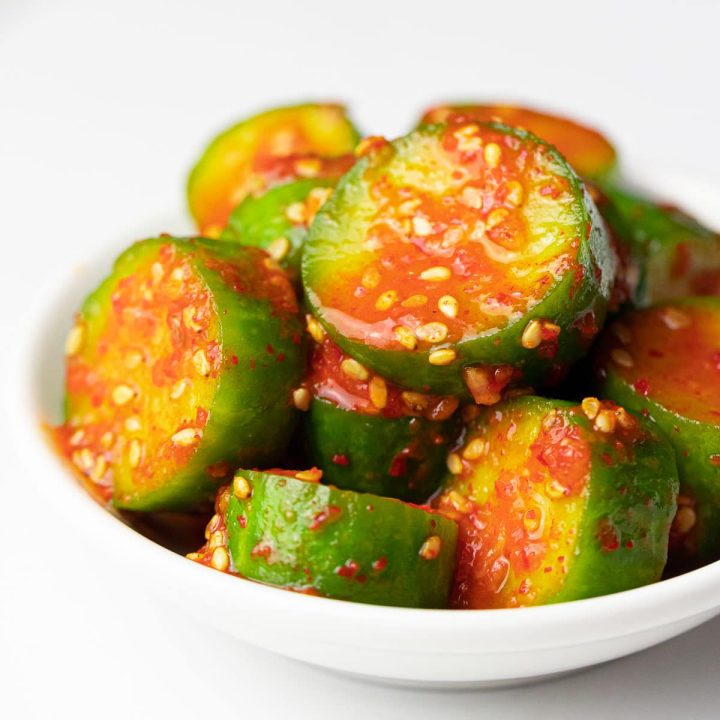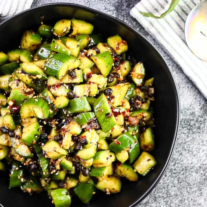 Spicy Cucumber Salad is a refreshing and flavorful side dish made of cooling fresh cucumbers spiked with chili crisp and other seasonings. It’s crunchy and light and full of flavor.
