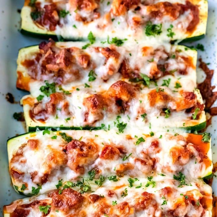 Easy zucchini boat recipe! These simple stuffed zucchini boats are filled with a hearty Italian sausage sauce and topped with melted mozzarella cheese.
