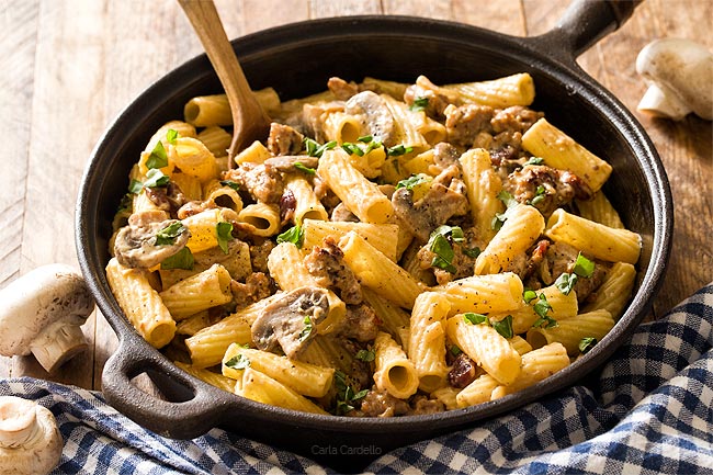 Sausage mushroom pasta combines savory Italian sausage, a creamy Alfredo sauce, and a hint of sweetness for a hearty, comforting dinner for two. Just add a side salad to make it a complete meal.