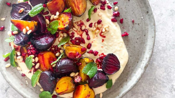 Vibrant and cozy, this roasted baby beet appetizer is ideal for holiday or winter gatherings. The beets on a bed of hummus taste incredible together.