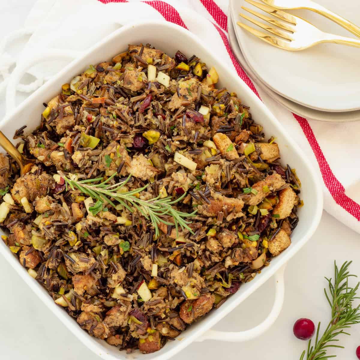This simple wild rice stuffing is loaded with hearty whole-grain wild rice, sweet apples, tart cranberries, crunchy nuts, and your choice of gluten-free or regular bread. It’s a tasty, easy-to-make twist on classic stuffing.