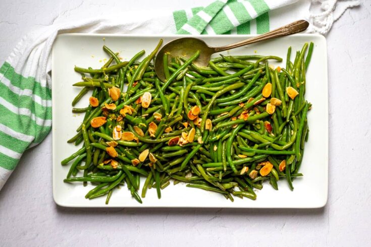 This simple green bean almondine (or amandine) features fresh or frozen green beans sautéed in butter and finished with crunchy toasted almonds.