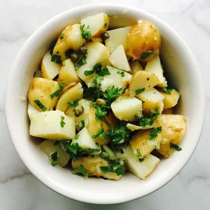 This potato salad recipe, inspired by French cuisine, offers a refreshing substitute for the traditional mayonnaise version. Dressed with a zesty white wine vinaigrette featuring capers and fresh herbs, it delivers a bright and tangy flavor.