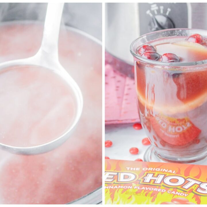 Some call this Warm Christmas Punch Or Hot Cinnamon Punch. It's made in the slow cooker with cranberry juice, pineapple juice, red hot cinnamon candies, and cinnamon sticks.