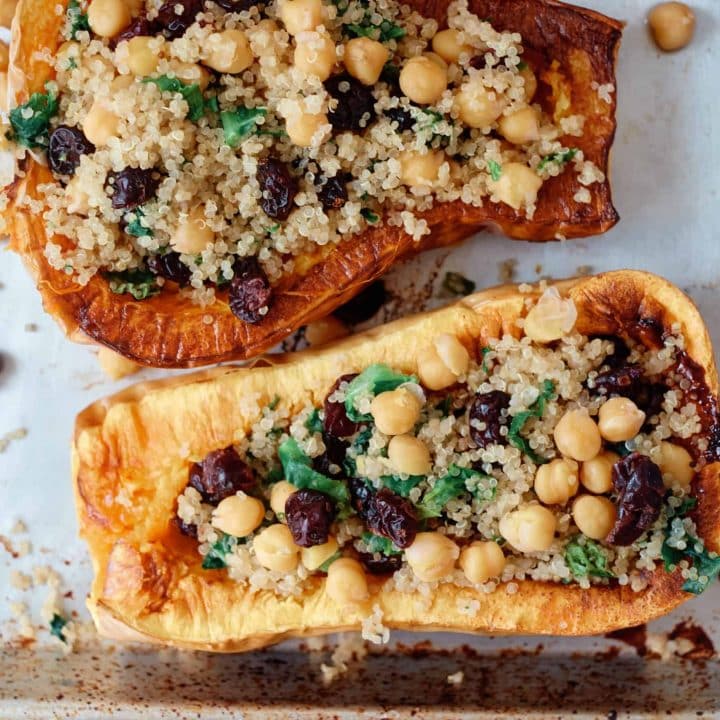 This Quinoa Stuffed Butternut Squash is delicious, easy to make, and makes a great healthy family meal! These stuffed squash are aromatic and filled with cooked kale, quinoa, cranberries, and chickpeas. This butternut squash recipe is packed with nutrients and flavor and it is a must-try meal idea!