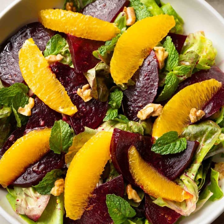 This vegan roasted beet and orange salad features roasted beets and fresh oranges on a bed of mixed greens. The dish will look beautiful on your Thanksgiving dinner table
