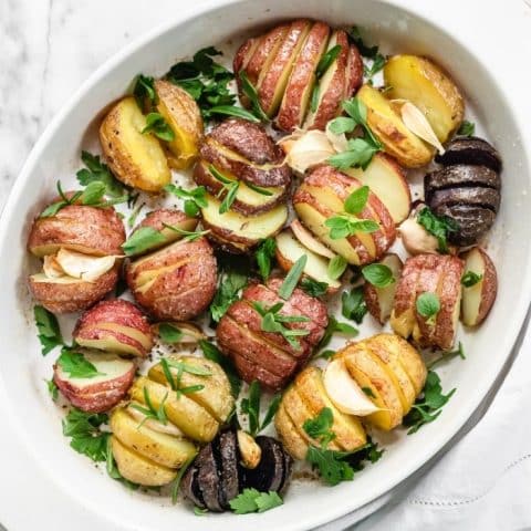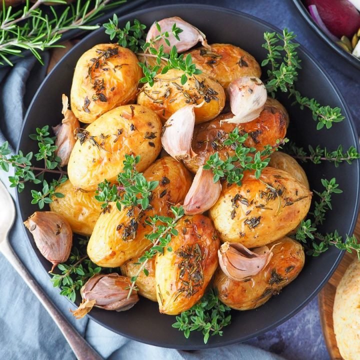 These roasted mini potatoes are quick and easy to throw together. The perfect side for when you need some roasted carby goodness.