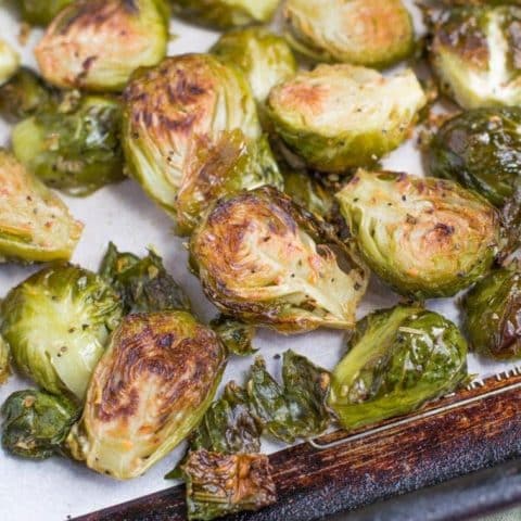 Crispy, crunchy, roasted Brussels sprouts with garlic are the perfect anytime side dish. Just 3 ingredients, and ready in 35 minutes!