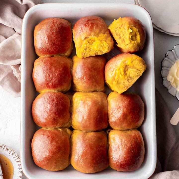Soft and fluffy pumpkin dinner rolls which are vegan, eggless and so easy to make! You'll need only 6 key ingredients for this simple recipe.